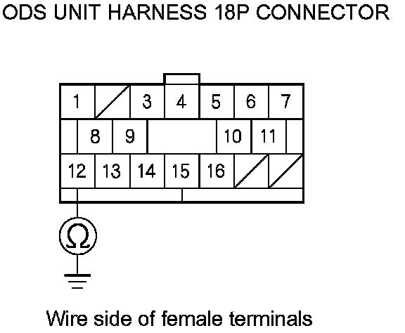 11. Measure the resistance between ODS unit harness 18P connector terminal No. 12 and body ground. There should be less than 1.0 Ohms.