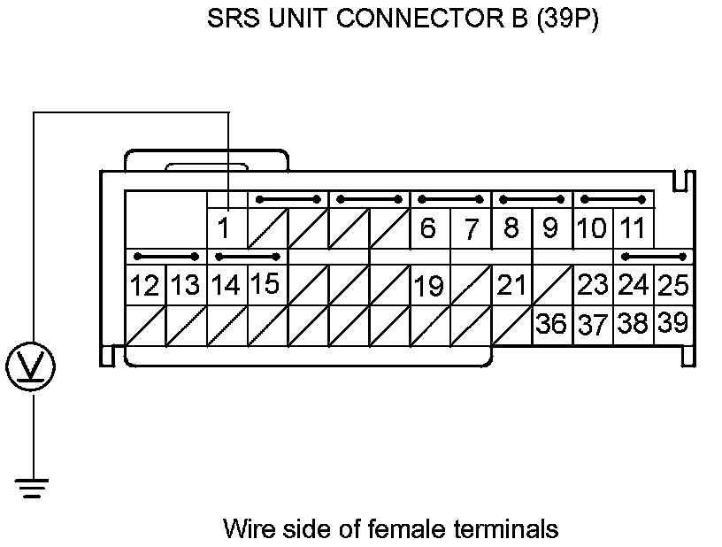 14. Measure the resistance between SRS unit connector B (39P) terminal No. 1 and body ground. There should be an open circuit or at least 1 MOhms.