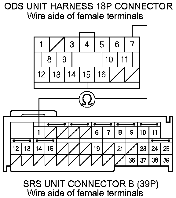 17. Measure the resistance between SRS unit connector B (39P) terminal No. 1 and ODS unit harness 18P connector terminal No. 7. There should be less than 1.0 Ohms.