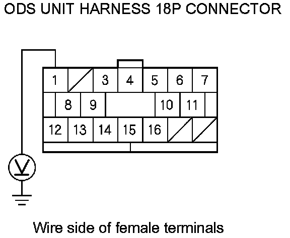 9. Measure the voltage between ODS unit harness 18P connector terminal No. 1 and body ground. There should be battery voltage.