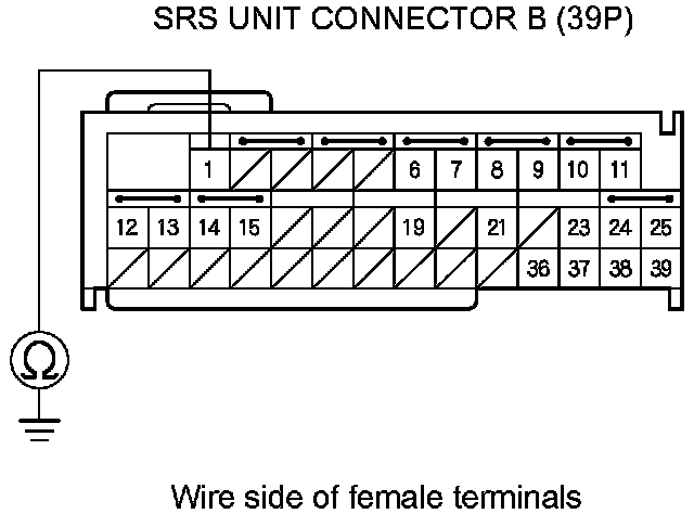 14. Measure the resistance between SRS unit connector B (39P) terminal No. 1 and body ground. There should be 1 MOhms.