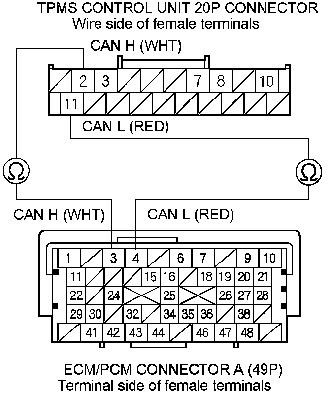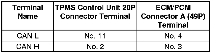 14. Check for continuity between the TPMS control unit 20P connector terminals and the ECM/PCM connector A (49P) terminals individually (see table).