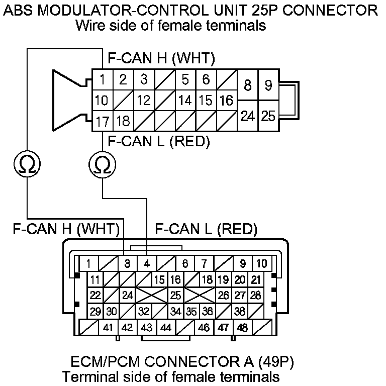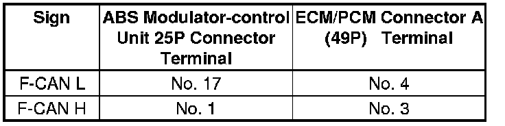 9. Check for continuity between the ABS modulator-control unit 25P connector terminal and ECM/PCM connector A (49P) terminal (see table).