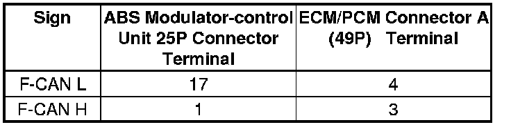 9. Check for continuity between the ABS modulator-control unit 25P connector terminal and ECM/PCM connector A (49P) terminal (see table).