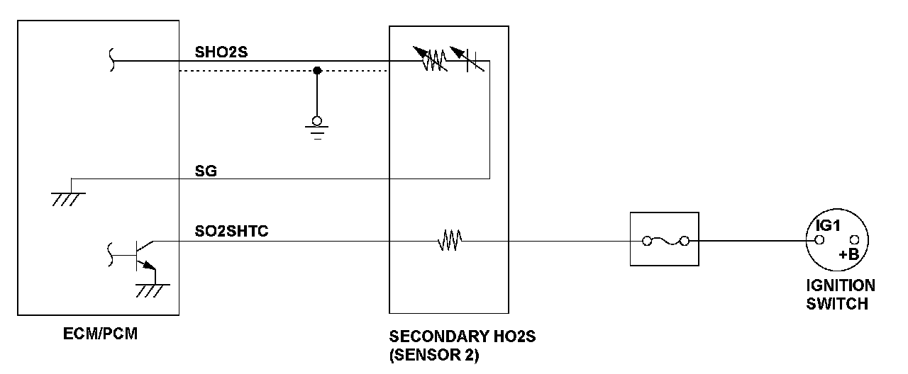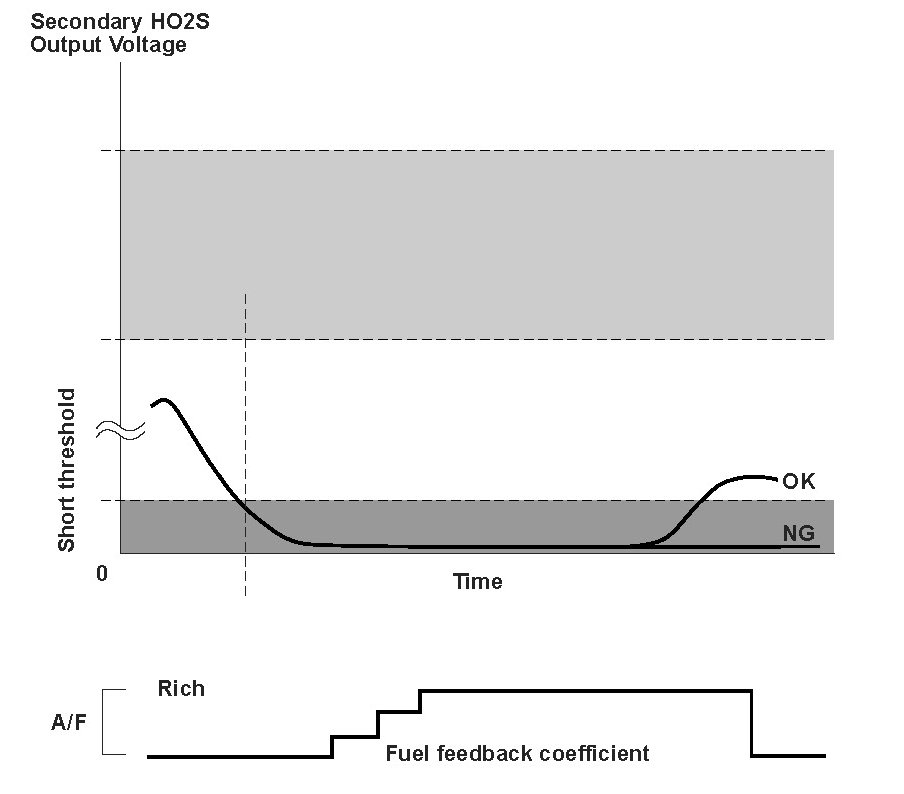 The secondary heated oxygen sensor (HO2S) (sensor 2) detects the oxygen content in the exhaust gas downstream of the three way catalytic converter (TWC) during stoichiometric air/fuel ratio feedback control based on the air/fuel ratio (A/F) sensor (sensor 1) output voltage. The secondary HO2S controls the air/fuel ratio from the A/F sensor output voltage so that the TWC efficiency is optimized. After current is applied to the secondary HO2S heater, if the secondary HO2S output continues to be low (lean) during feedback control, the engine control module (ECM)/powertrain control module (PCM) detects a malfunction and stores a DTC.