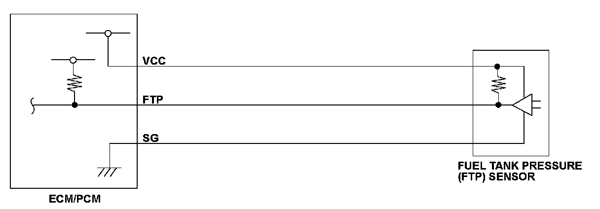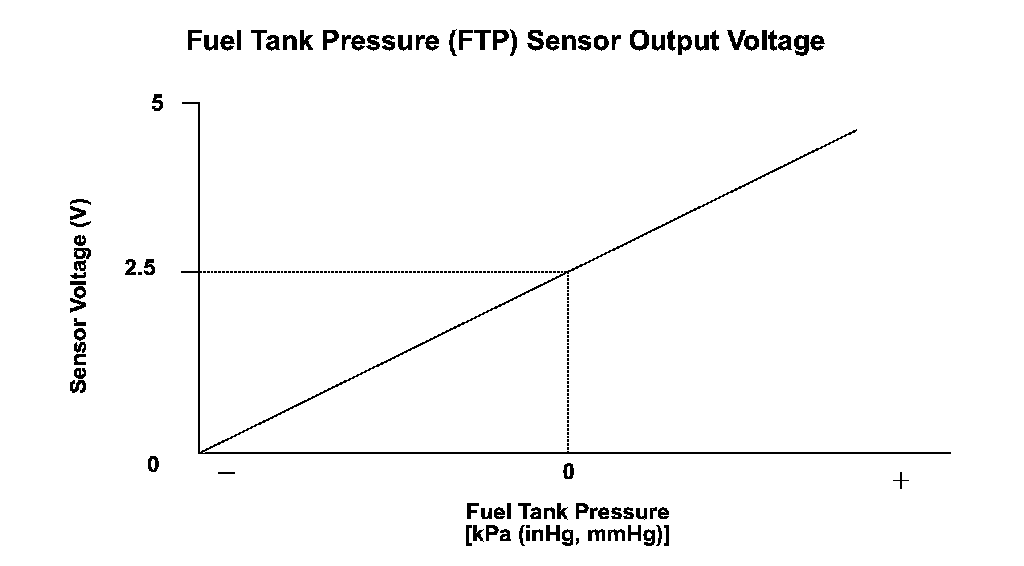 The fuel tank pressure (FTP) sensor is installed on the evaporative emission (EVAP) canister and detects the fuel tank pressure. The FTP sensor is used to detect leaks in the EVAP system. The engine control module (ECM)/powertrain control module (PCM) monitors the FTP sensor output voltage. The FTP sensor output voltage rises as the fuel tank pressure increases. Conversely, the FTP sensor output voltage drops as the fuel tank pressure decreases. If the FTP sensor output voltage does not reach a target value for a set time after starting the engine in a cold condition, the ECM/PCM detects a malfunction and stores a DTC.