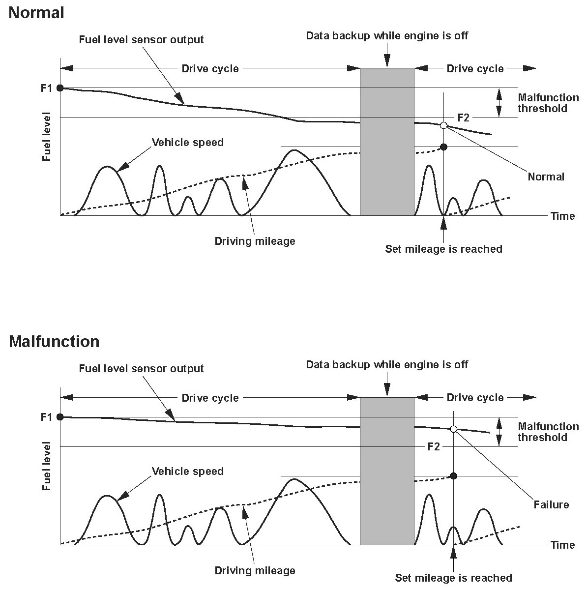 The fuel level sensor is incorporated with the fuel pump and installed in the fuel tank. Using a built-in potentiometer and float, it converts the movement of the float into electrical signals that correspond to the fuel level, and it indicates the amount of fuel in the fuel tank. If the engine control module (ECM)/powertrain control module (PCM) receives no change in the fuel level sensor output after driving for a specified number of miles, it detects a malfunction and stores a DTC.