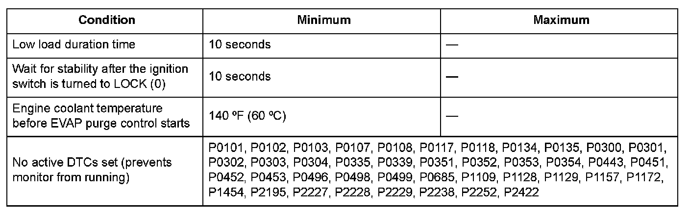 The output from the fuel tank pressure sensor is 0.2 kPa (0.07 inHg, 2 mmHg) or less for at least 10 seconds.