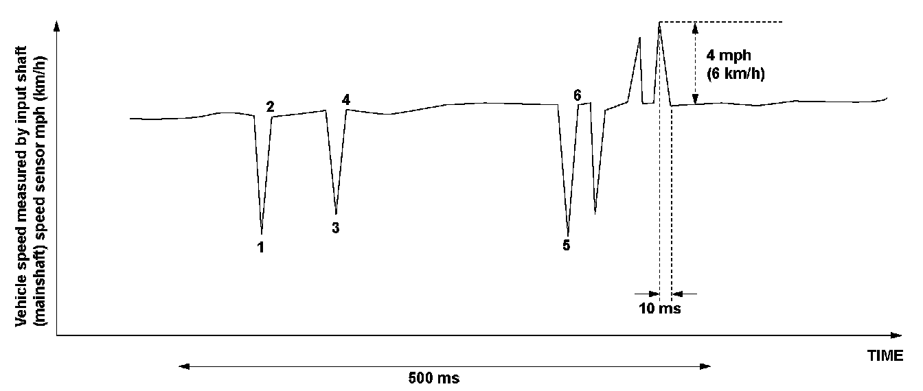 The fluctuation of the vehicle speed measured by the input shaft (mainshaft) speed sensor in 10 milliseconds is 4 mph (6km/h) or more, and it fluctuates at least six times within 500 milliseconds.