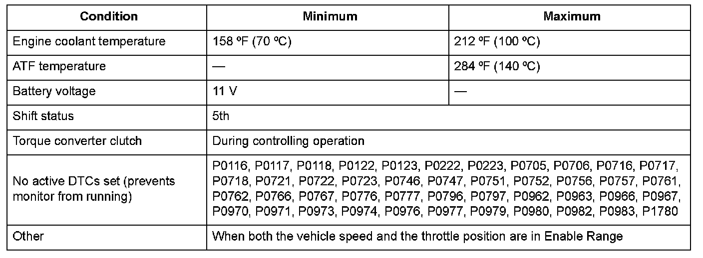 The power transfer capacity of the torque converter clutch is controlled by the balance of automatic transmission fluid (ATF) supplied to and discharged from the torque converter. When hydraulic pressure is applied internally, the torque converter clutch turns ON, and when hydraulic pressure is applied from the back pressure side, the lock-up clutch turns OFF. As the hydraulic pressure from the internal pressure side increases, the power transfer capacity of the torque converter clutch increases. The direction of hydraulic pressure supply is switched by shift solenoid valve D and the lock-up shift valve. ATF is supplied from the internal pressure side to shift solenoid valve D when the signal from the powertrain control module (PCM) is ON (12 V), and ATF is supplied from the back pressure side when it is OFF (0 V). The balance of internal pressure and back pressure is controlled by A/T clutch pressure control solenoid valve A and the lock-up control valve. A/T clutch pressure control solenoid valve A maximizes the power transfer capacity of the torque converter clutch when the signal from the PCM is ON (1 A), and it minimizes the power transfer capacity of the torque converter clutch when the signal from the PCM is OFF (0 A). If the ratio of engine speed and mainshaft speed is not about 1:1 while the PCM is issuing the command to turn shift solenoid valve D and A/T clutch pressure control solenoid valve A ON, the PCM detects a faulty lock-up control system and stores a DTC.