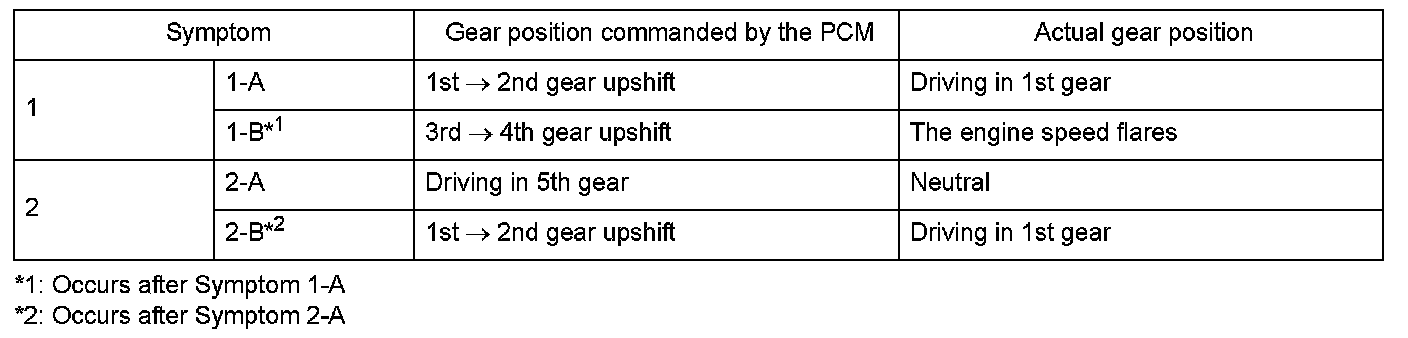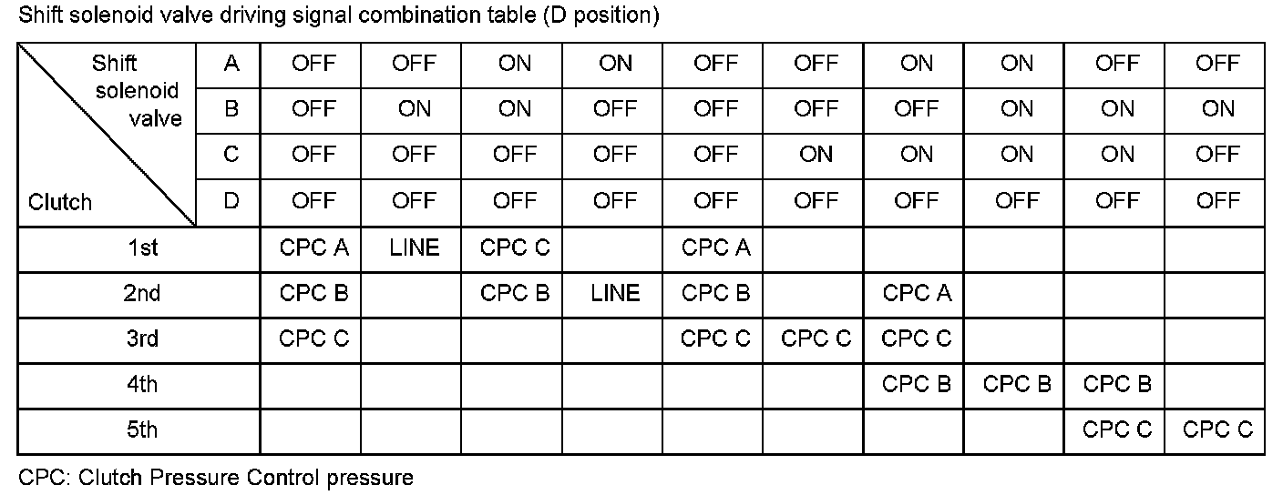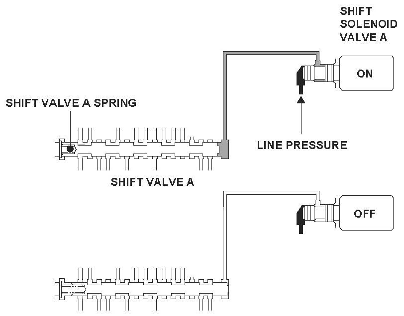 Shift solenoid valve A is installed in the transmission housing. It is controlled by the ON/OFF signal from the powertrain control module (PCM) to apply line pressure to shift valve A. The signal from the PCM is output to apply clutch pressure control pressure to the proper gear clutch according to the gear change schedule. When the signal to shift solenoid valve A from the PCM is ON, and line pressure is applied to shift valve A, it operates against the shift valve A spring. When the signal to shift solenoid valve A from the PCM is OFF, and line pressure is discharged, shift valve A is inactive. The PCM monitors the input shaft (mainshaft) speed and the output shaft (countershaft) speed at the gear change determined by the shift schedule. When an improper gear ratio is output compared to the predetermined gear change mode, the PCM detects a shift solenoid valve A OFF failure and stores a DTC.