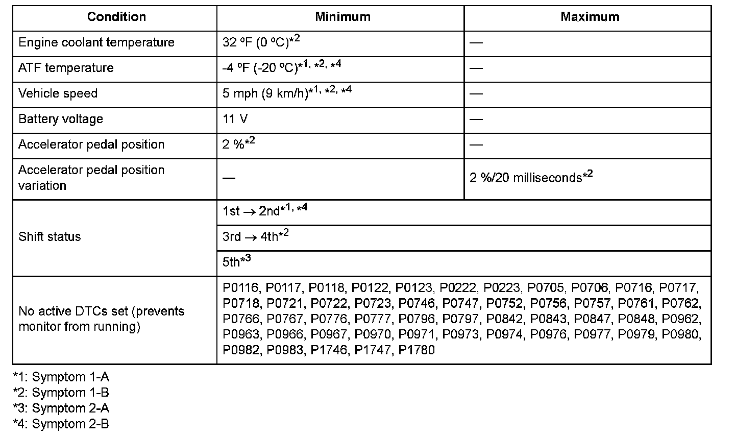 Conditions for setting the DTC