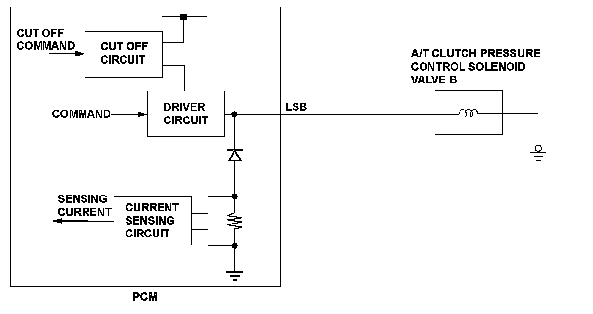 A/T clutch pressure control solenoid valve B is used for clutch pressure control. A spool in A/T clutch pressure control solenoid valve B pushes the valve according to the duty cycle that is controlled by the powertrain control module (PCM). (The hydraulic pressure is proportional to the current.) The PCM measures the current flowing through A/T clutch pressure control solenoid valve B, and uses feedback control to compensate for the difference between the actual current and the commanded one. If the measured current for the PCM output duty cycle is not within a specified range (open or short), the PCM detects a malfunction and stores a DTC.