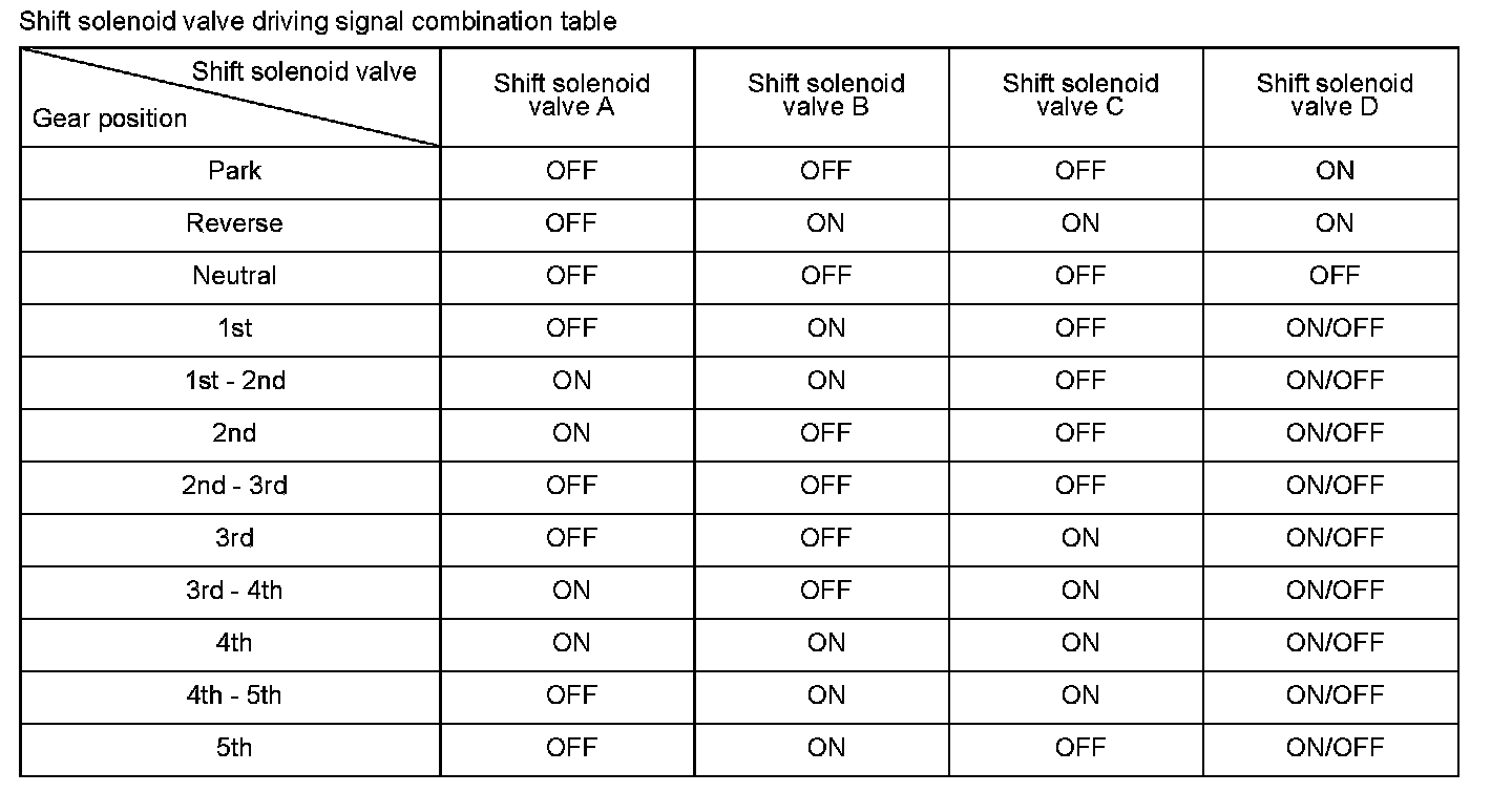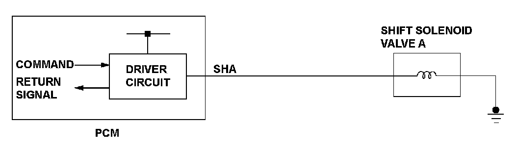 When shift solenoid valves A, B, C, and D are turned ON, the hydraulic pressure circuit opens. The hydraulic pressure circuit supplies/discharges hydraulic pressure to/from each clutch according to the combination of the ON/OFF status of the shift solenoid valves. The powertrain control module (PCM) commands the driver circuit to turn on the shift solenoid valve. The circuit diagnoses malfunctions such as a circuit short or open, and sends back a return signal during the PCM's command. When the return signal does not match the PCM command, a malfunction is detected by the PCM. When the return signal does not match the PCM command to turn ON the shift solenoid valve, the PCM detects a malfunction and stores a DTC.