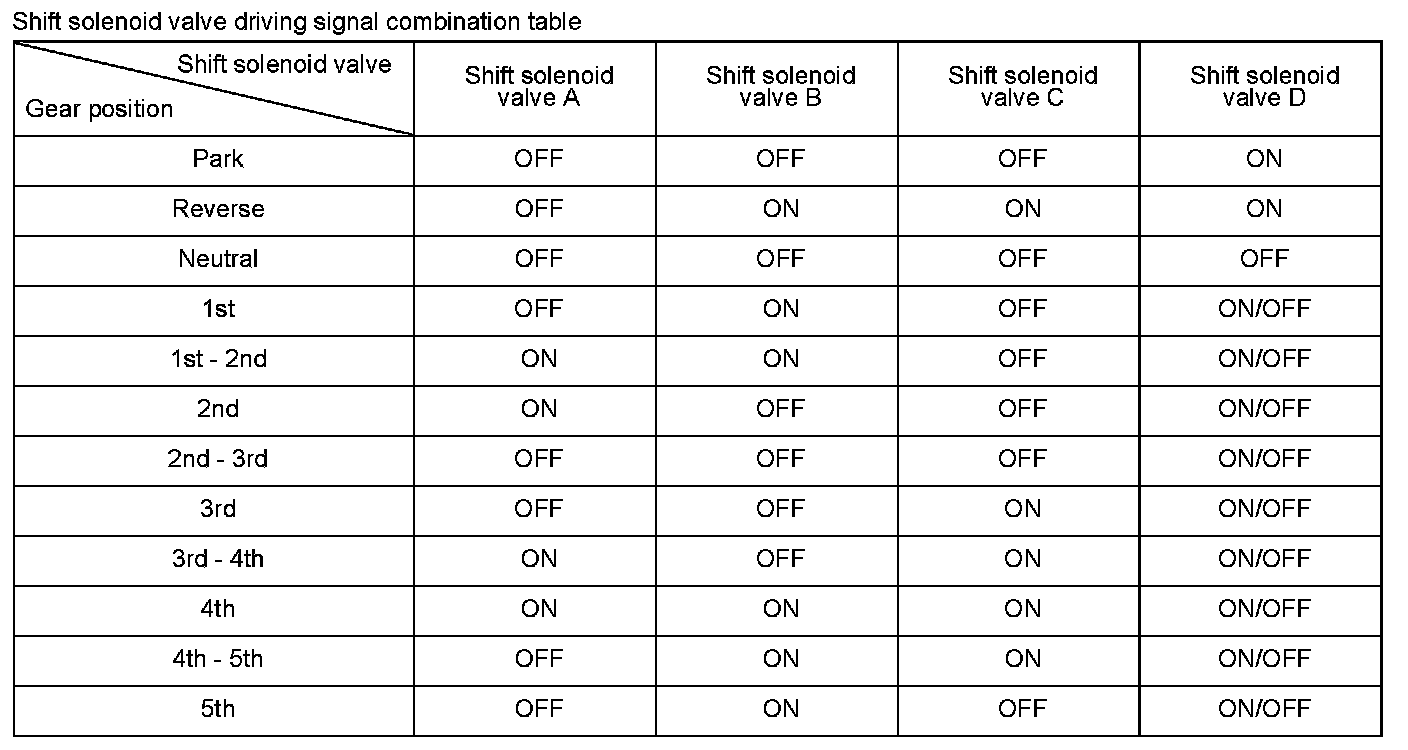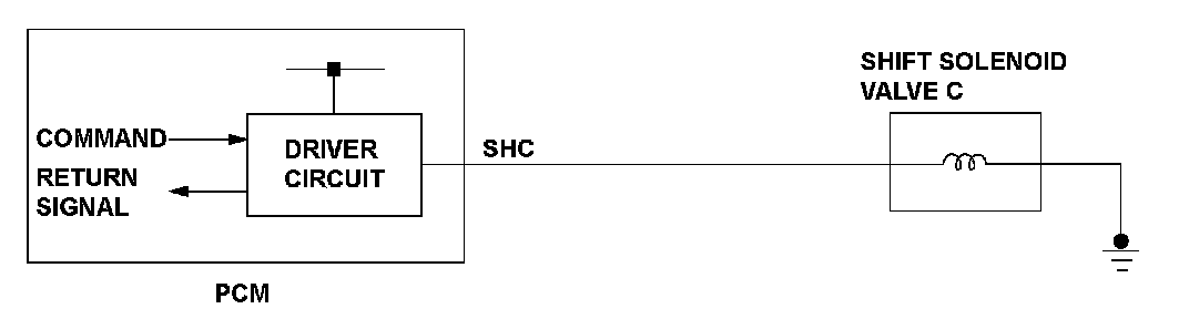 When shift solenoid valves A, B, C, and D are turned ON, the hydraulic pressure circuit opens. The hydraulic pressure circuit supplies/discharges hydraulic pressure to/from each clutch according to the combination of the ON/OFF status of the shift solenoid valves. The powertrain control module (PCM) commands the driver circuit to turn on the shift solenoid valve. The circuit diagnoses malfunctions such as a circuit short or open, and sends back a return signal during the PCM's command. When the return signal does not match the PCM command, a malfunction is detected by the PCM. When the return signal does not match the PCM command to turn OFF the shift solenoid valve, the PCM detects a malfunction and stores a DTC.