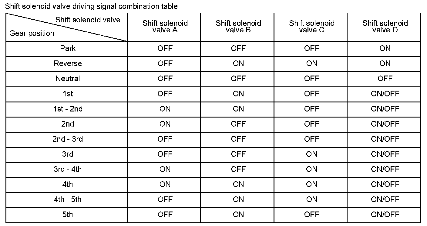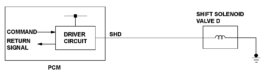 When shift solenoid valves A, B, C, and D are turned ON, the hydraulic pressure circuit opens. The hydraulic pressure circuit supplies/discharges hydraulic pressure to/from each clutch according to the combination of the ON/OFF status of the shift solenoid valves. The powertrain control module (PCM) commands the driver circuit to turn on the shift solenoid valve. The circuit diagnoses malfunctions such as a circuit short or open, and sends back a return signal during the PCM's command. When the return signal does not match the PCM command, a malfunction is detected by the PCM. When the return signal does not match the PCM command to turn ON the shift solenoid valve, the PCM detects a malfunction and stores a DTC.
