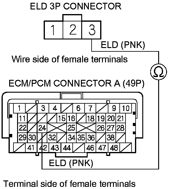 9. Check for continuity between ELD 3P connector terminal No. 3 and ECM/PCM connector terminal A24.