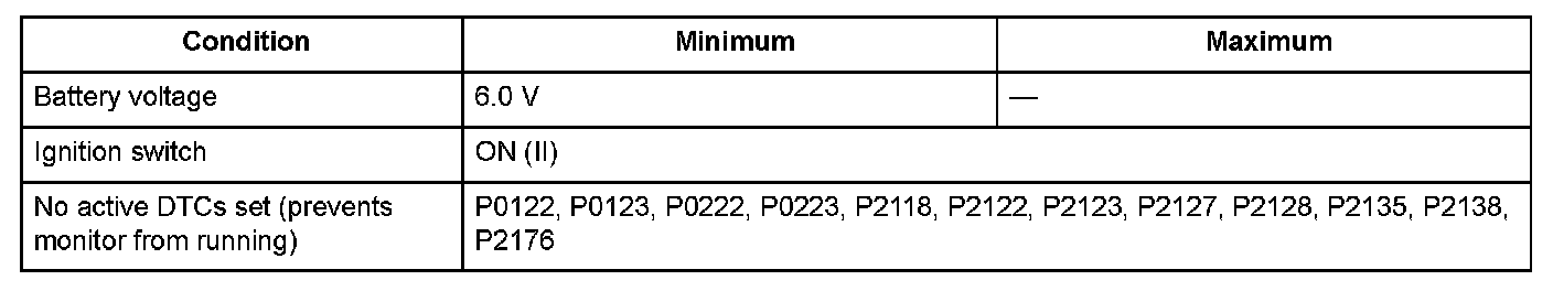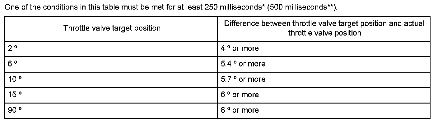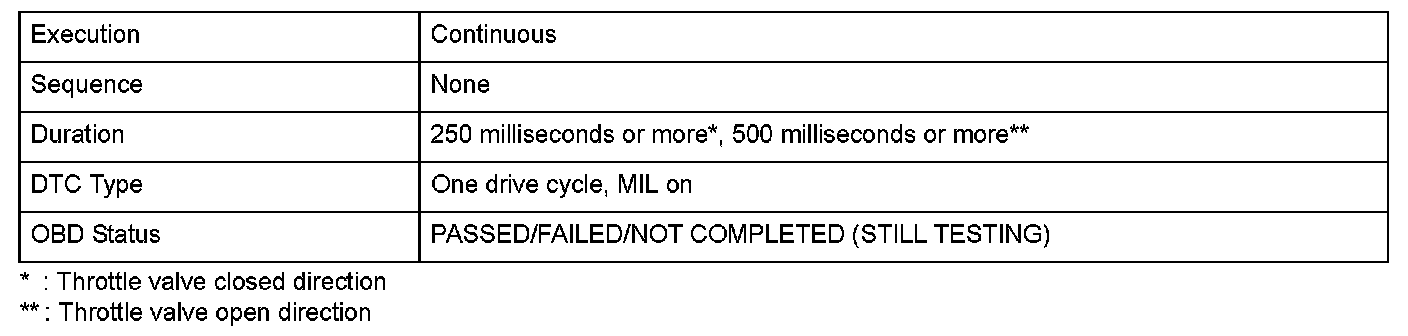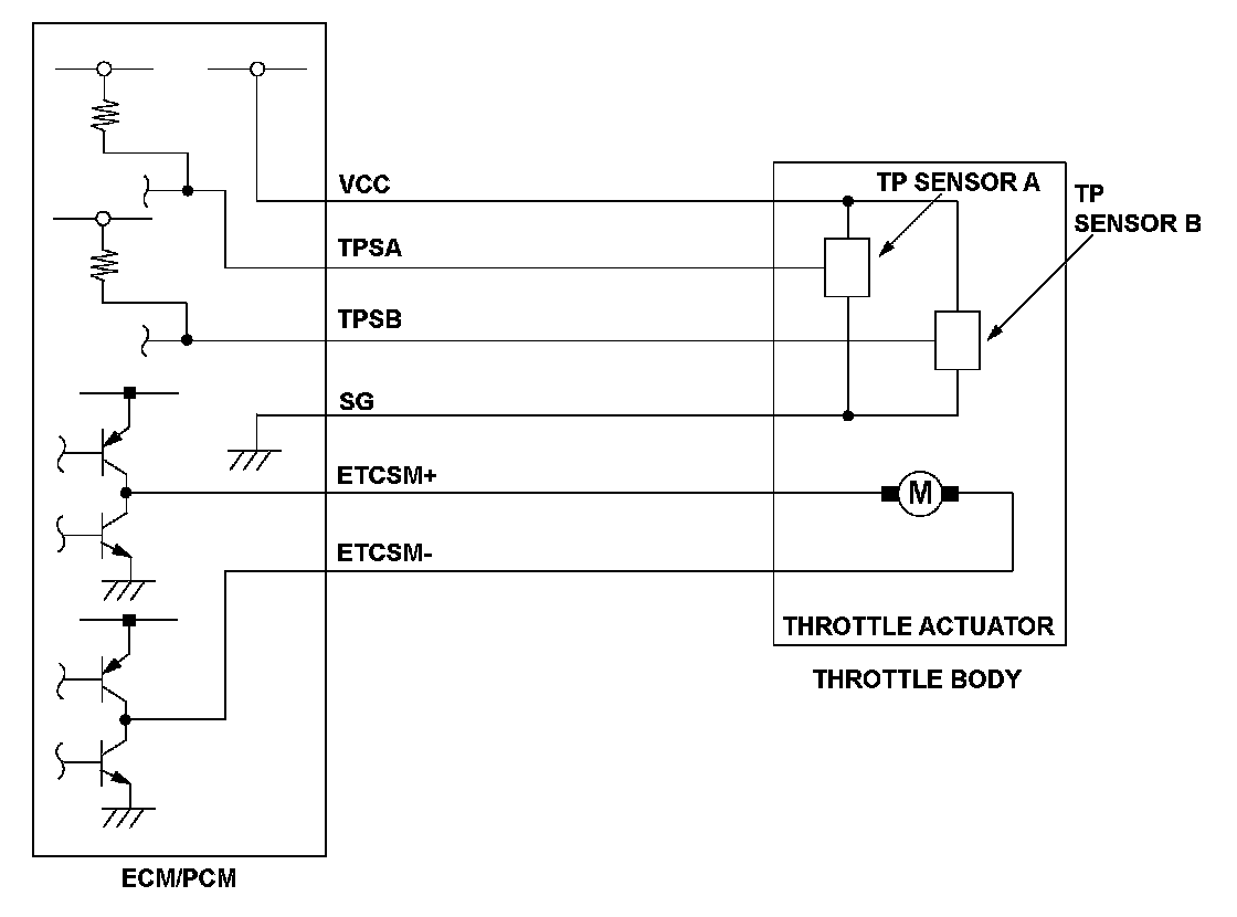 The electronic throttle control system controls the throttle valve opening. The system includes the throttle actuator, the throttle valve, throttle position (TP) sensors A and B, the electronic throttle control system (ETCS) control relay, the accelerator pedal position (APP) sensor, and the engine control module (ECM)/powertrain control module (PCM). When the accelerator pedal is pressed, the APP sensor detects the accelerator opening value. The accelerator pedal opening value is converted to a signal in the APP sensor and transmitted to the ECM/PCM to compute the target position. The ECM/PCM determines the throttle valve target position according to the signal received and operates the throttle actuator to move the throttle valve to the target position. The actual throttle valve position is determined by TP sensor A (installed in the throttle body). The ECM/PCM compares the throttle valve target opening angle and the actual throttle valve opening angle from TP sensor A, and when the difference exceeds the specification, the ECM/PCM detects the malfunction of the electronic throttle control system and stores a DTC.