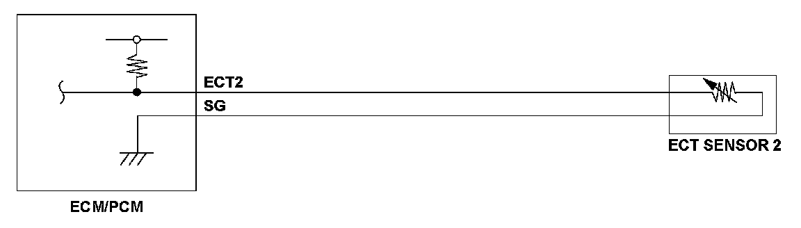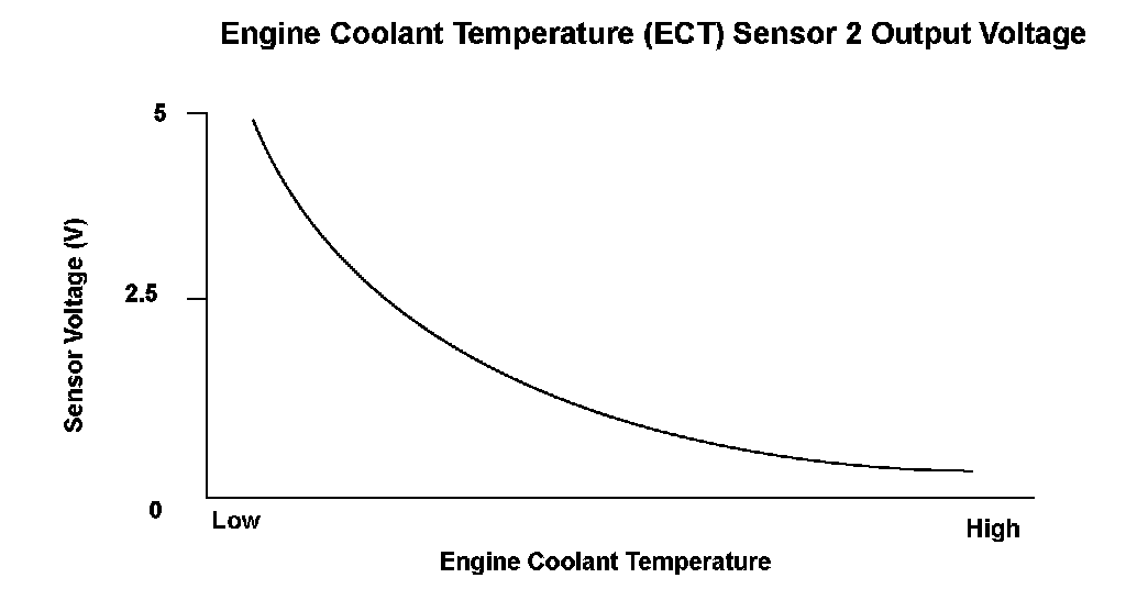 Engine coolant temperature (ECT) sensor 2 is a thermistor attached to the water passage. The engine control module (ECM)/powertrain control module (PCM) applies voltage (about 5 V) to the ECT2 signal circuit through a pull-up resistor. As the engine coolant temperature cools, ECT sensor 2 resistance increases, and the ECM/PCM detects a high signal voltage. As the engine coolant warms, the sensor resistance decreases, and the ECM/PCM detects a low signal voltage. If the ECT sensor 2 output voltage is a set value when the engine coolant temperature is low, the ECM/PCM detects a malfunction and stores a DTC.