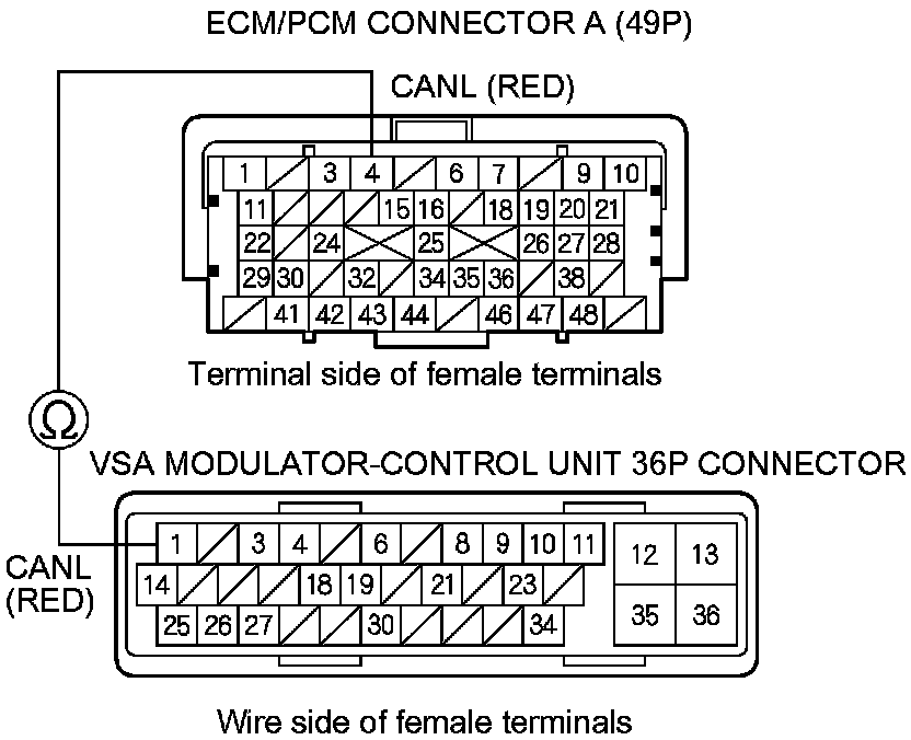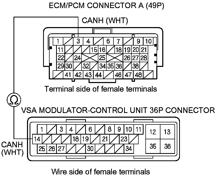 10. Check for continuity between ECM/PCM connector terminal A3 and VSA modulator-control unit 36P connector terminal No. 14.