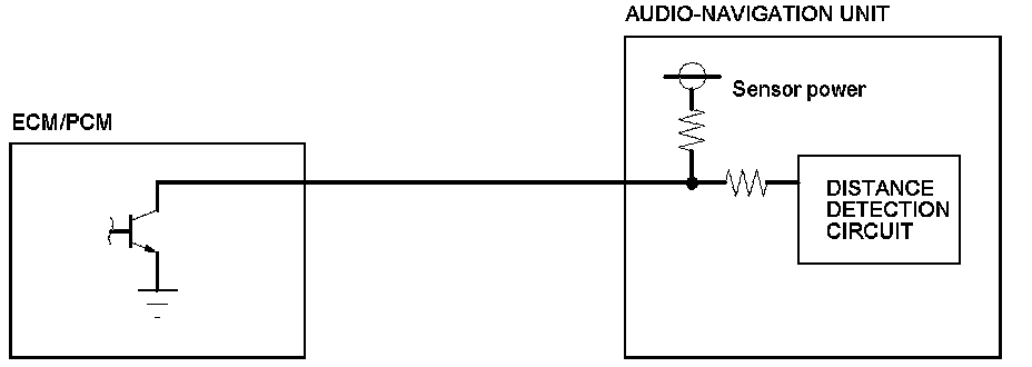 The audio-navigation unit calculates the vehicle position (the driving direction and the current position) by receiving the directional change signals from the yaw rate sensor and the travel distance signals from vehicle speed pulse (VSP) signal of the ECM/PCM.
