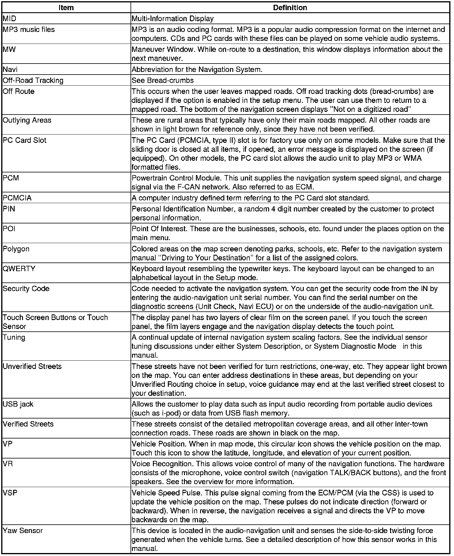The following is a glossary of terms pertaining to the voice recognition navigation system. All items may not apply to this vehicle. See the navigation system manual for more information.