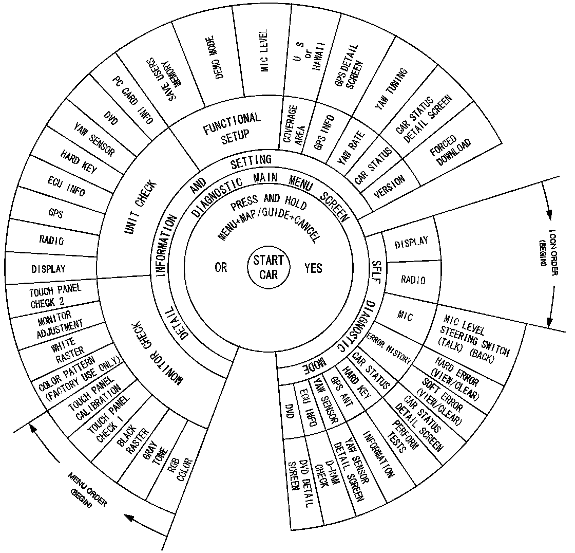 Access to the diagnostic features begins by starting the vehicle. This is necessary so the system can check the other systems connected by various busses. After starting the vehicle you can enter the diagnostic mode either by pressing and holding MENU + MAP/GUIDE + CANCEL.