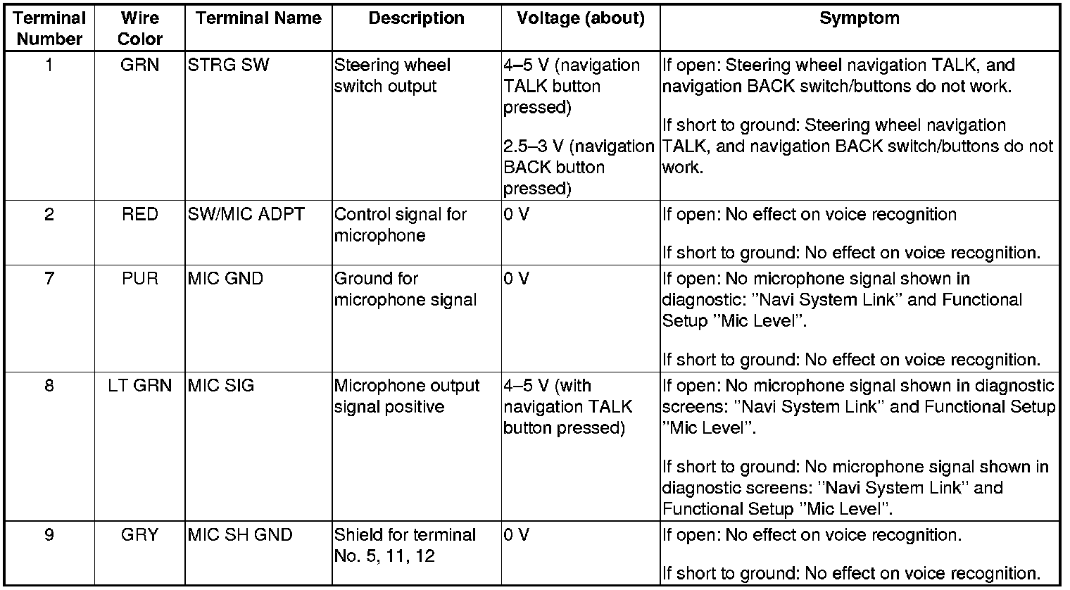 The navigation system is composed of the audio-navigation unit, the ECM/PCM (vehicle speed signal), the GPS antenna, the microphone, and the voice control switch.