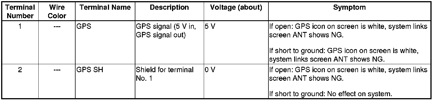 The GPS receiver is built into the audio-navigation unit. It calculates the vehicle position by receiving the signal from the GPS antenna. The current time, vehicle position and signal reception condition is transmitted from the GPS receiver to the navigation control unit to adjust vehicle position.