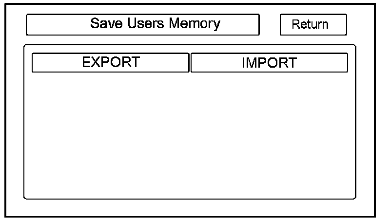 This is similar to saving and entering the customer's audio presets when replacing an audio unit. The transferred information includes their Setup settings and personal addresses. The dealer inserts a PC card (like the PC card in the HDS), and then selects the Save Users Memory function. The two functions in this diagnostic screen are Export and import. Export saves the customer's data to the PC card, and Import moves the PC card files to the new navigation core.