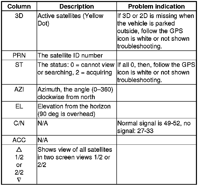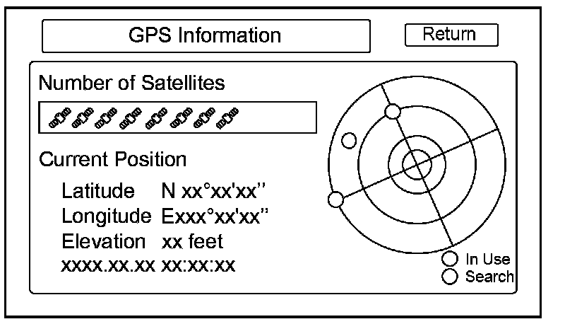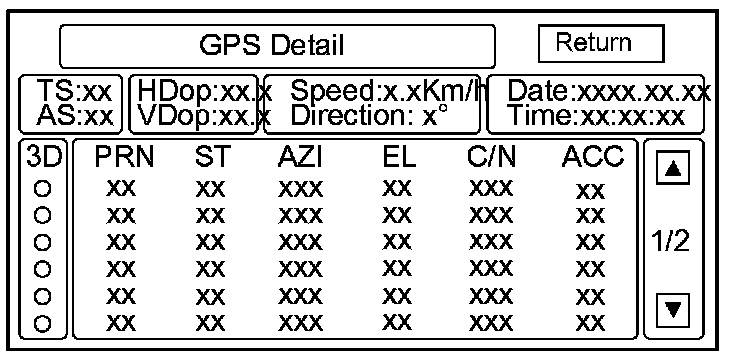 By pressing and holding the MENU button for 2 seconds, a GPS Detail screen appears. This screen displays real time incoming satellite positional data when the vehicle is outside in the open. The information shown on this screen is for factory use.