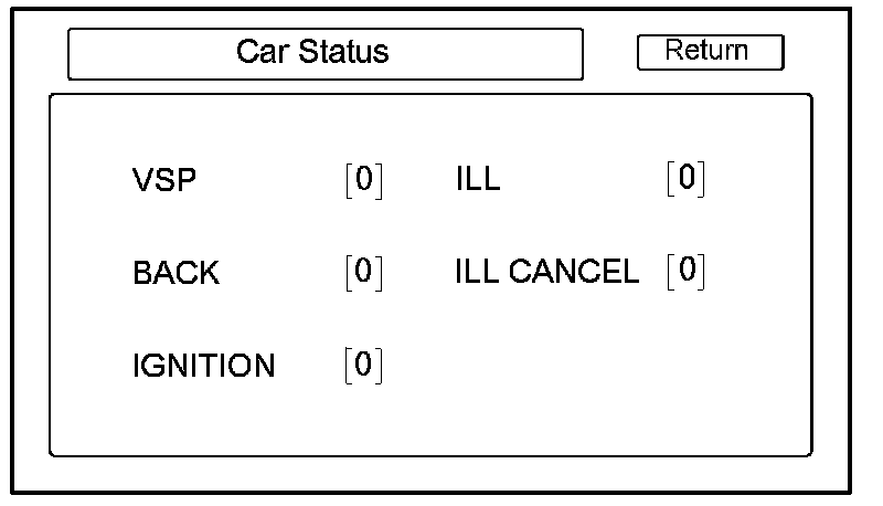 Use this screen to confirm that the audio-navigation unit is properly receiving input signals. Signals equal to (0) are OFF, and signals equal to (1) are ON. If the value on the display does not match the actual vehicle status, then check the wire carrying the signal.