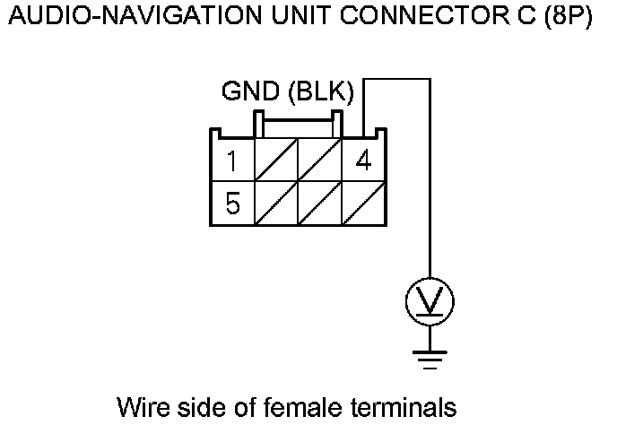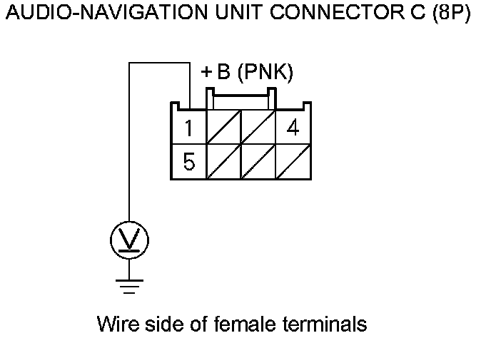 5. Measure the voltage between audio-navigation unit connector C (8P) terminal No. 1 and body ground.