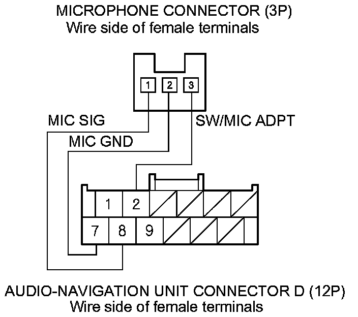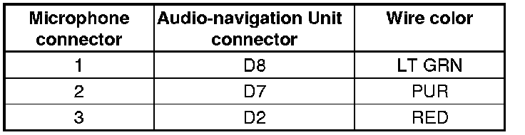 8. Check for continuity between navigation unit connector D (12P) and the microphone connector (3P) according to the table.