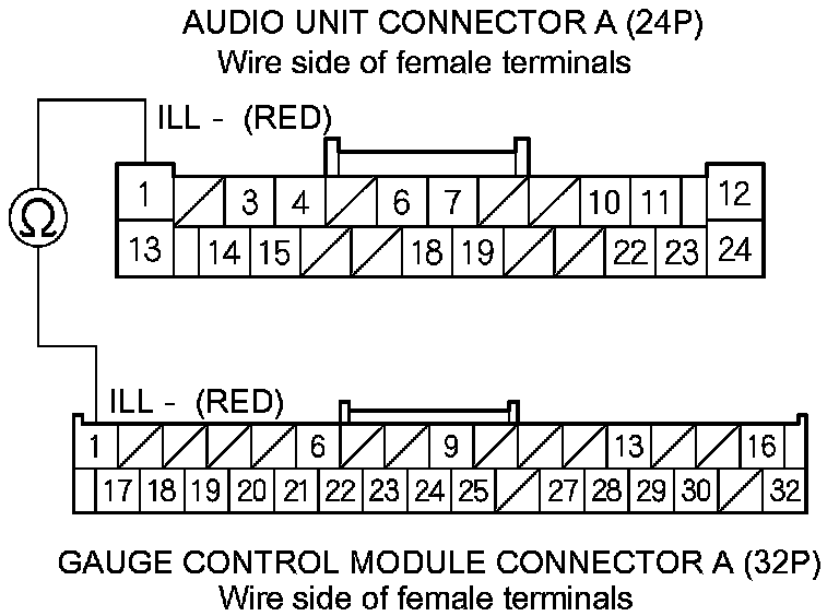 8. Check for continuity between audio unit connector A (24P) terminal No. 1 and gauge control module connector A (32P) terminal No. 1.