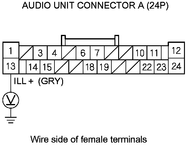 10. With the headlight switch still on, check for voltage between audio unit connector A (24P) terminal No. 13 and body ground.