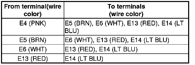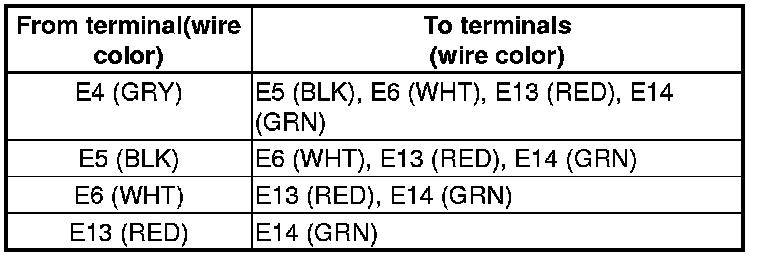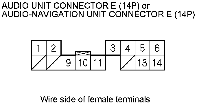 11. Check for continuity between the terminals of audio unit or audio-navigation unit connector E (14P) according to the table.