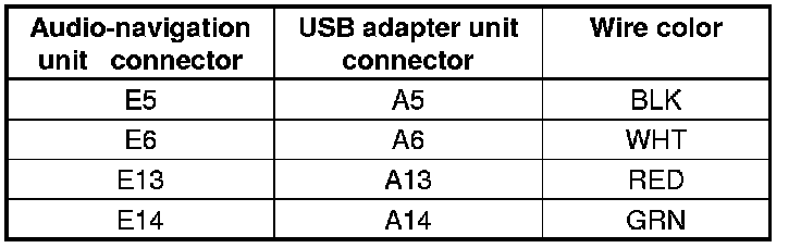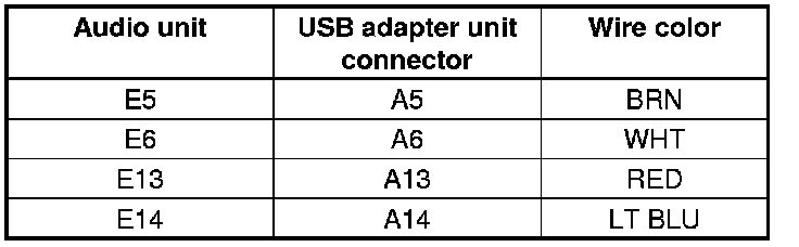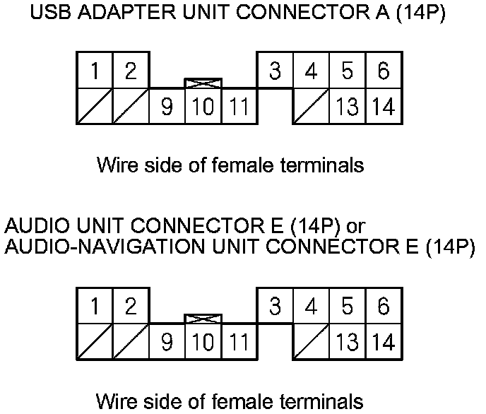 12. Check for continuity between audio unit or audio-navigation unit connector E (14P) and USB adapter unit connector A (14P) according to the table.