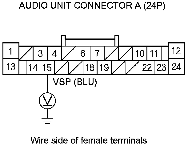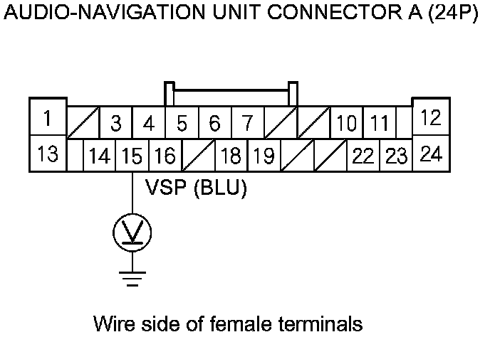 8. Slowly spin one of the front wheels by hand, and have an assistant measure the voltage at navigation or audio unit connector A (24P) terminal No. 15.
