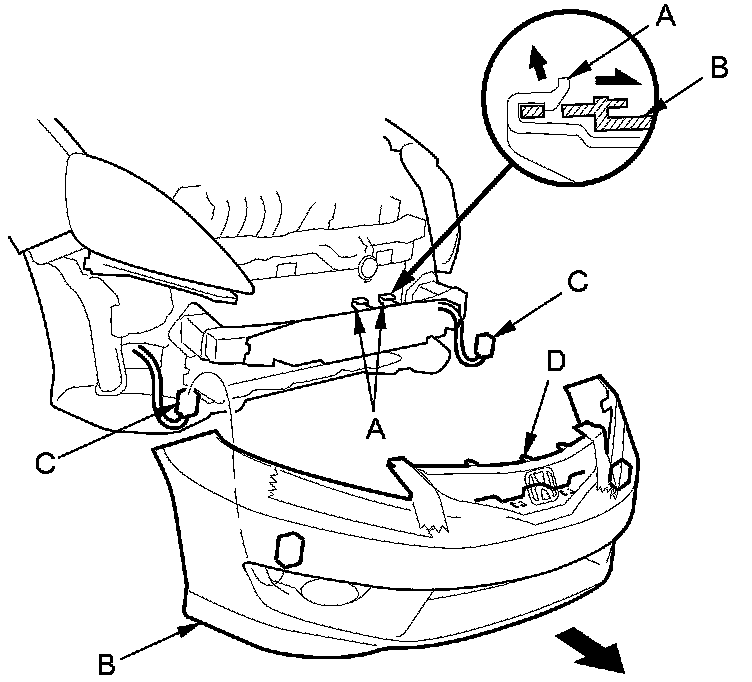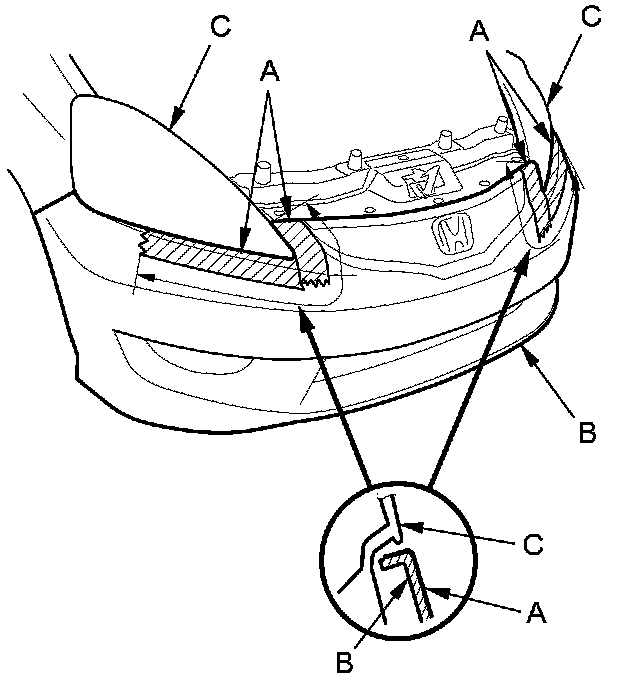 6. Release the hooks (A), and pull the front bumper (B) forward. Then hold the bumper, and disconnect the front fog light connectors (C), if equipped. Carefully remove the bumper.