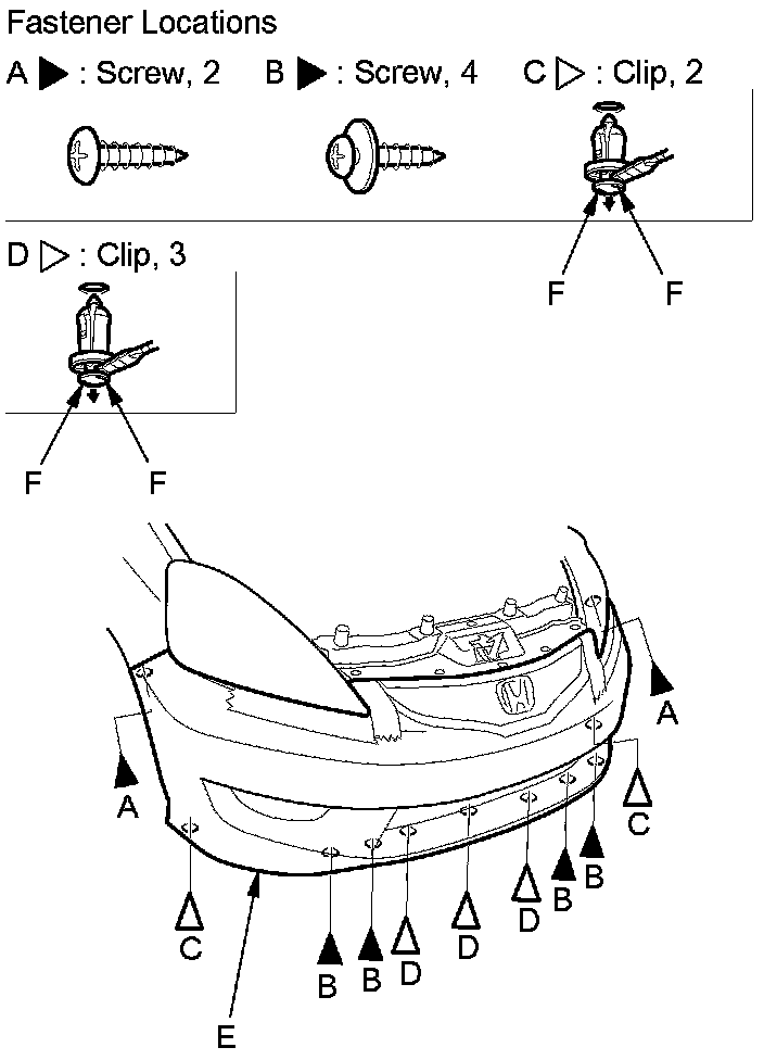 2. Remove the screws (A, B) and the clips (C, D) securing the front bumper (E).