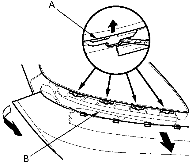 4. With the help of an assistant, release the bumper from the hooks (A) on the upper beam (B).