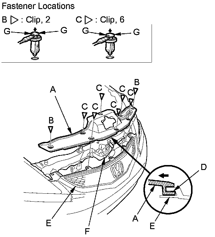 NOTE: To release the clips, pry up on the center pin at the notch (G).