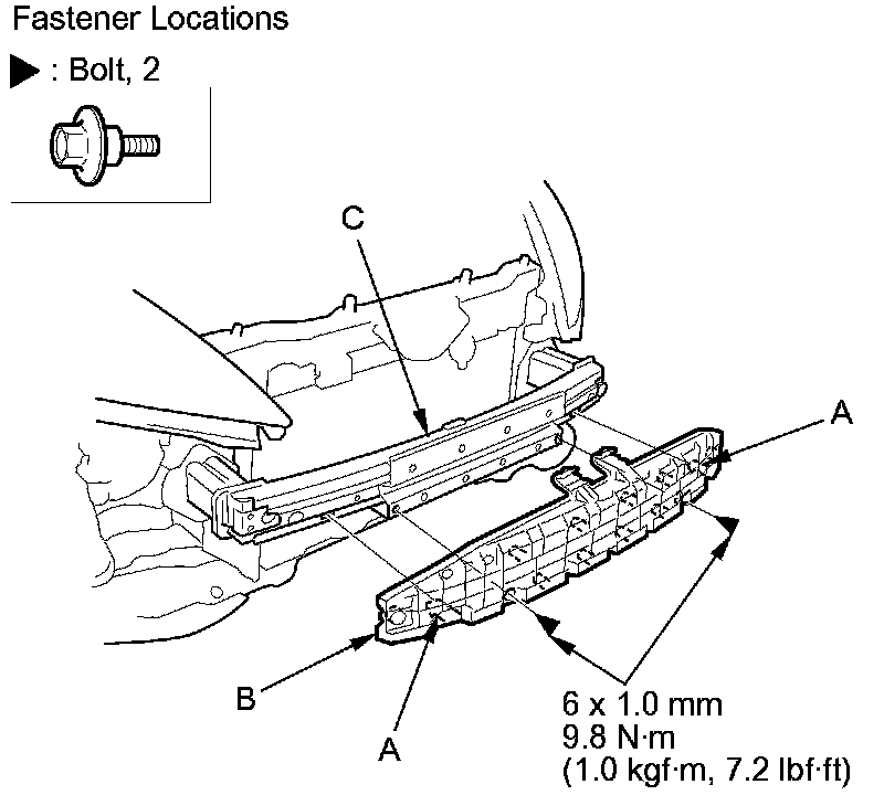 7. Remove the bolts and release the hooks (A), then remove the front bumper absorber (B) from the front bumper beam (C).