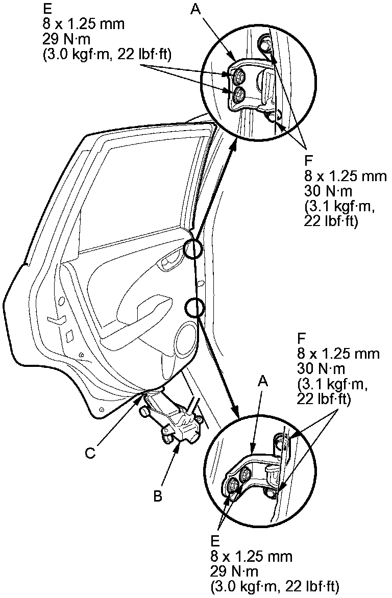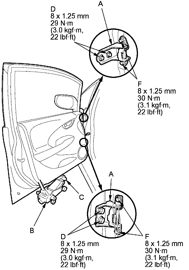 - On the front door: Remove the front inner fender. Front Inner Fender Replacement Loosen the hinge mounting bolts (D) slightly, and move the door backward or forward, up or down as necessary to equalize the gaps.