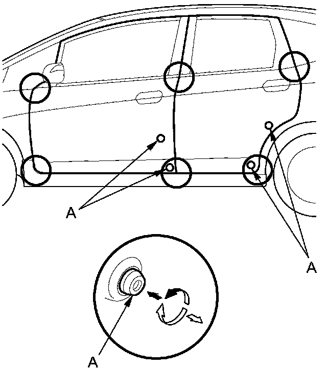 4. Check that the door and body edges are parallel. If necessary, adjust the door cushions (A) to make the rear of the doors flush with the body.