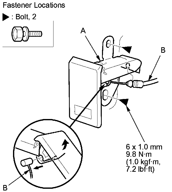 3. Disconnect the hood opener cable (B) from the hood release handle. Take care not to kink the cable.