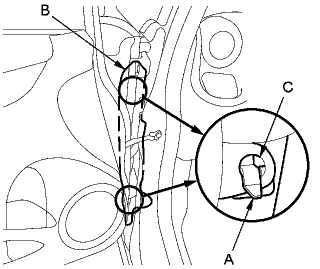 - Before installing the clips, make sure the hooks (A) of the front fender fairing (B) are installed into the holes (C) in the front fender securely.