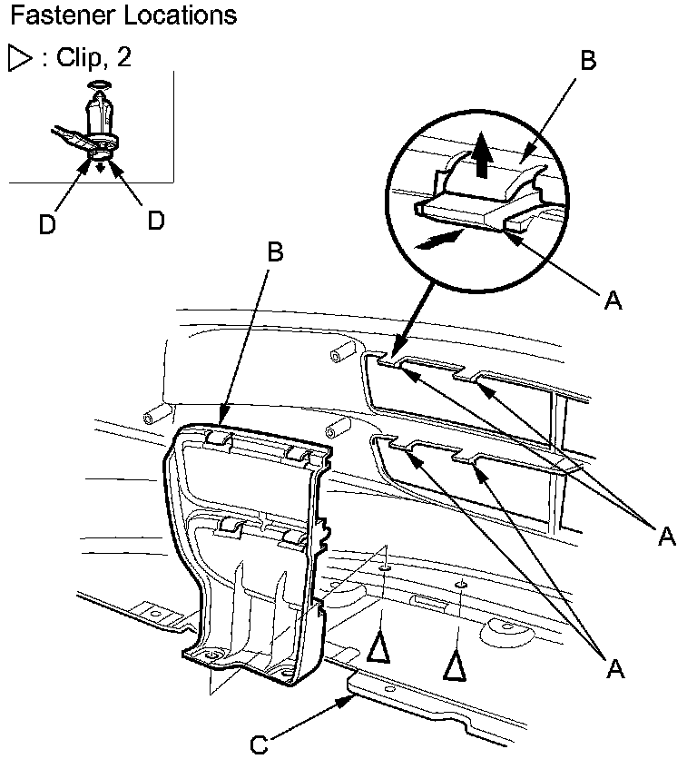 NOTE: To release the clips, pry up on the center pin at the notch (D).