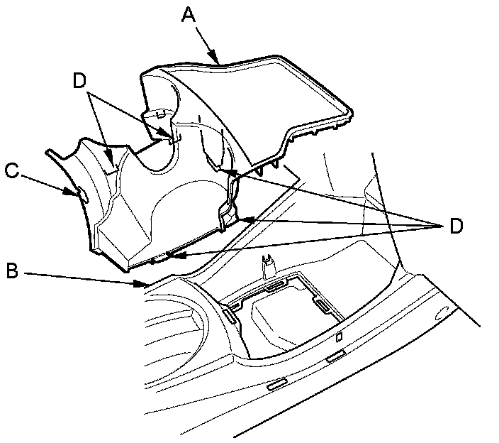 2. Carefully pull up the console lid to release the hooks (D).